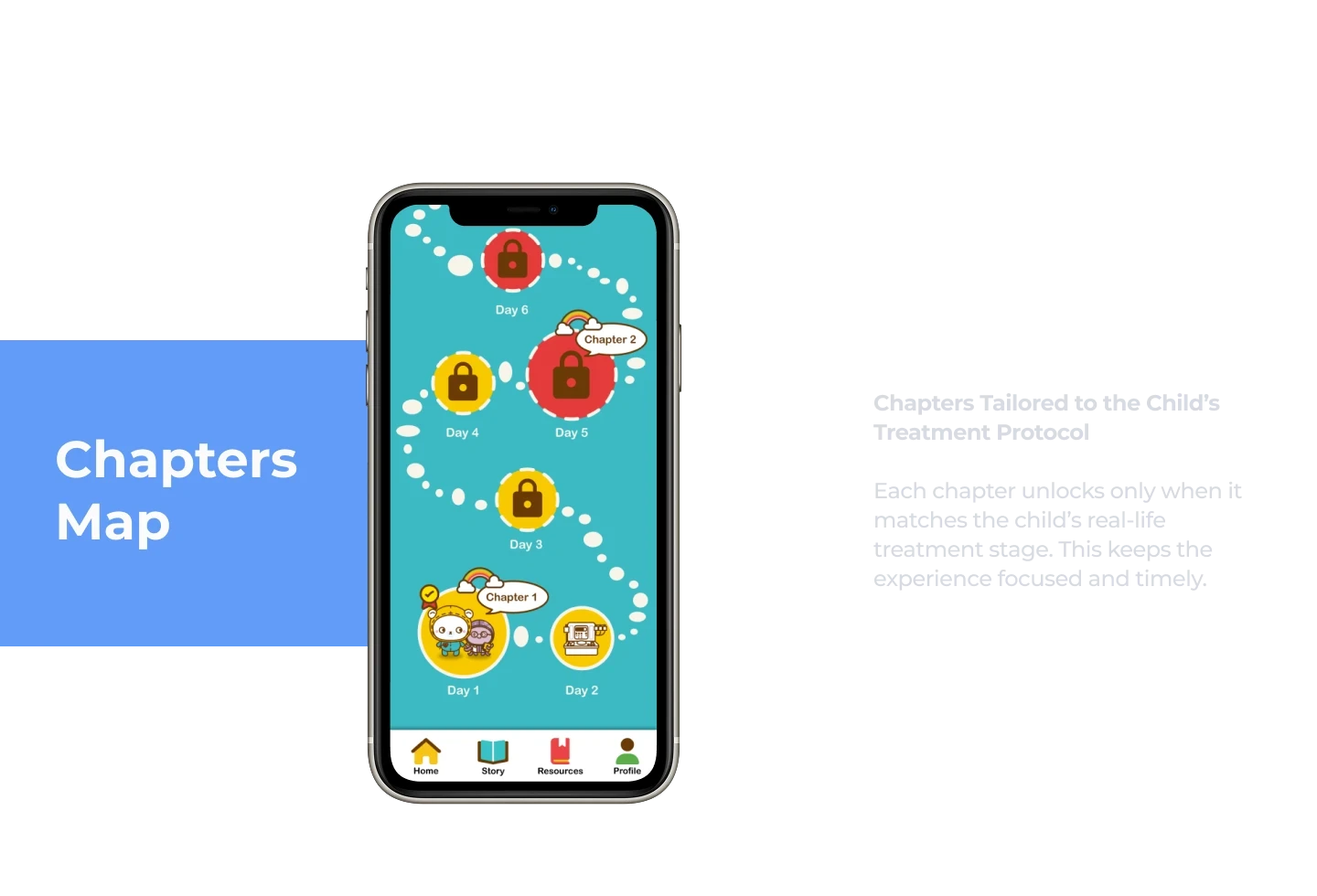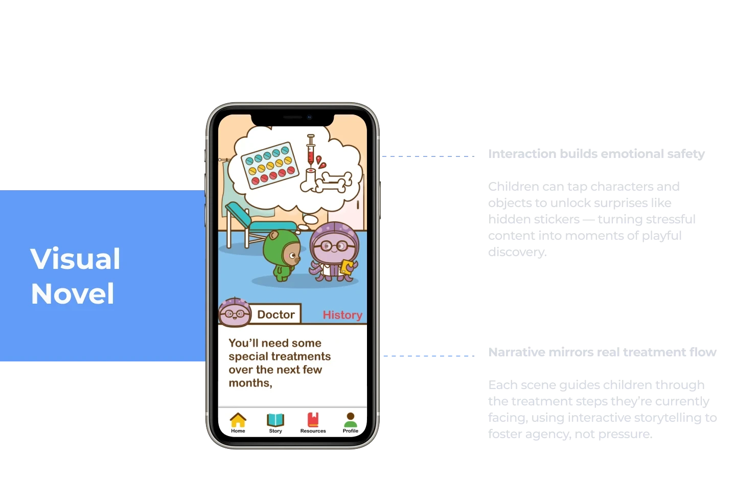The interactive visual novel is synced to the child's treatment protocol by the day, helping patients learn about today's treatment step and prepare them.